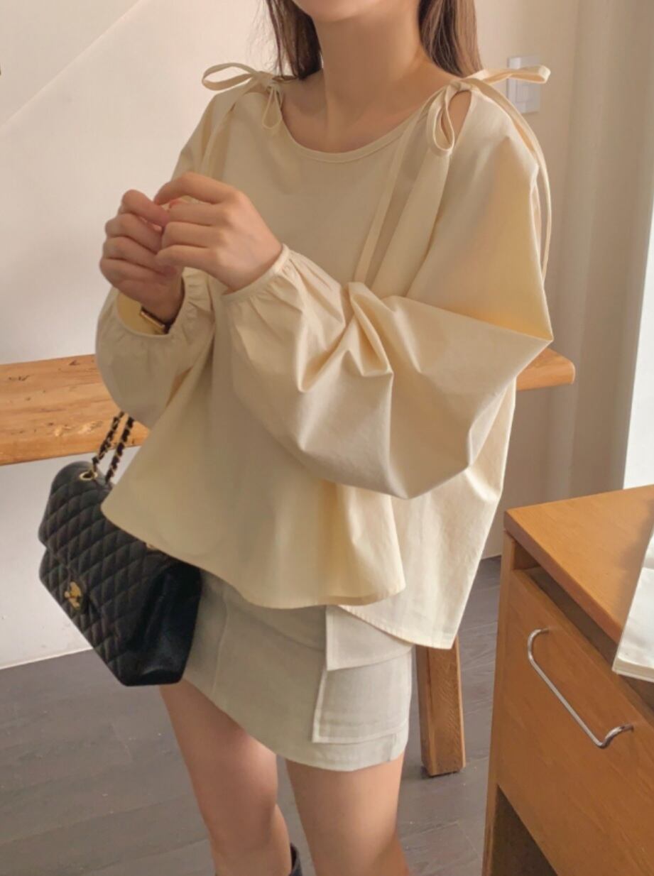 肩紐でちらっと肌見せ、リボンがキュートなブラウス