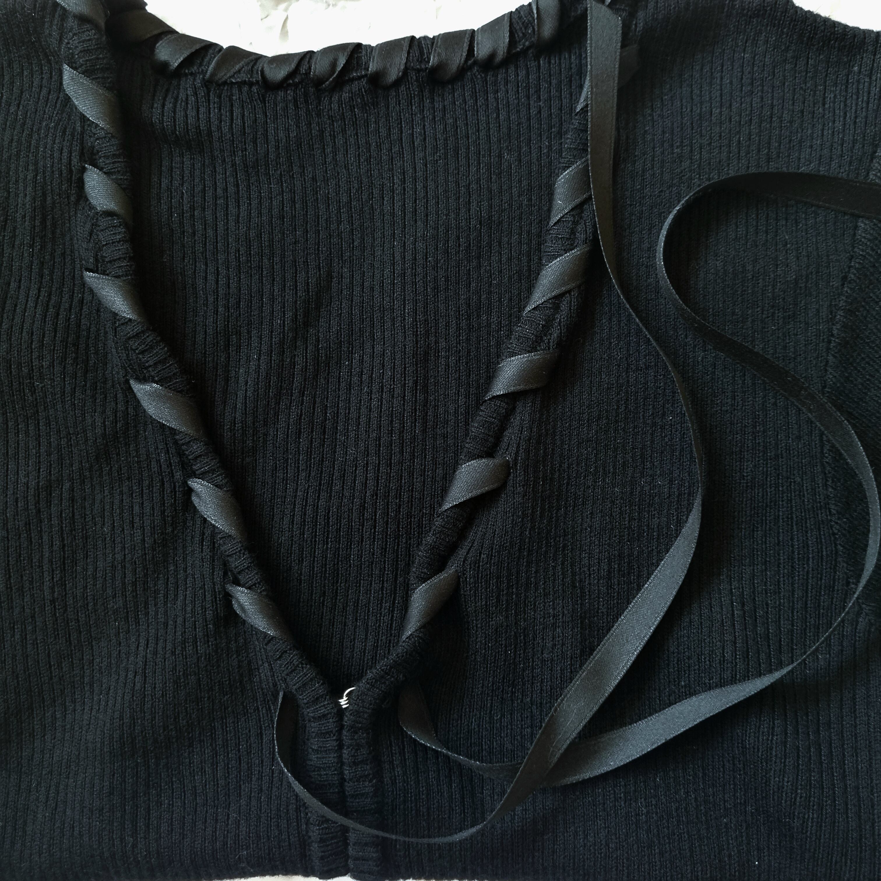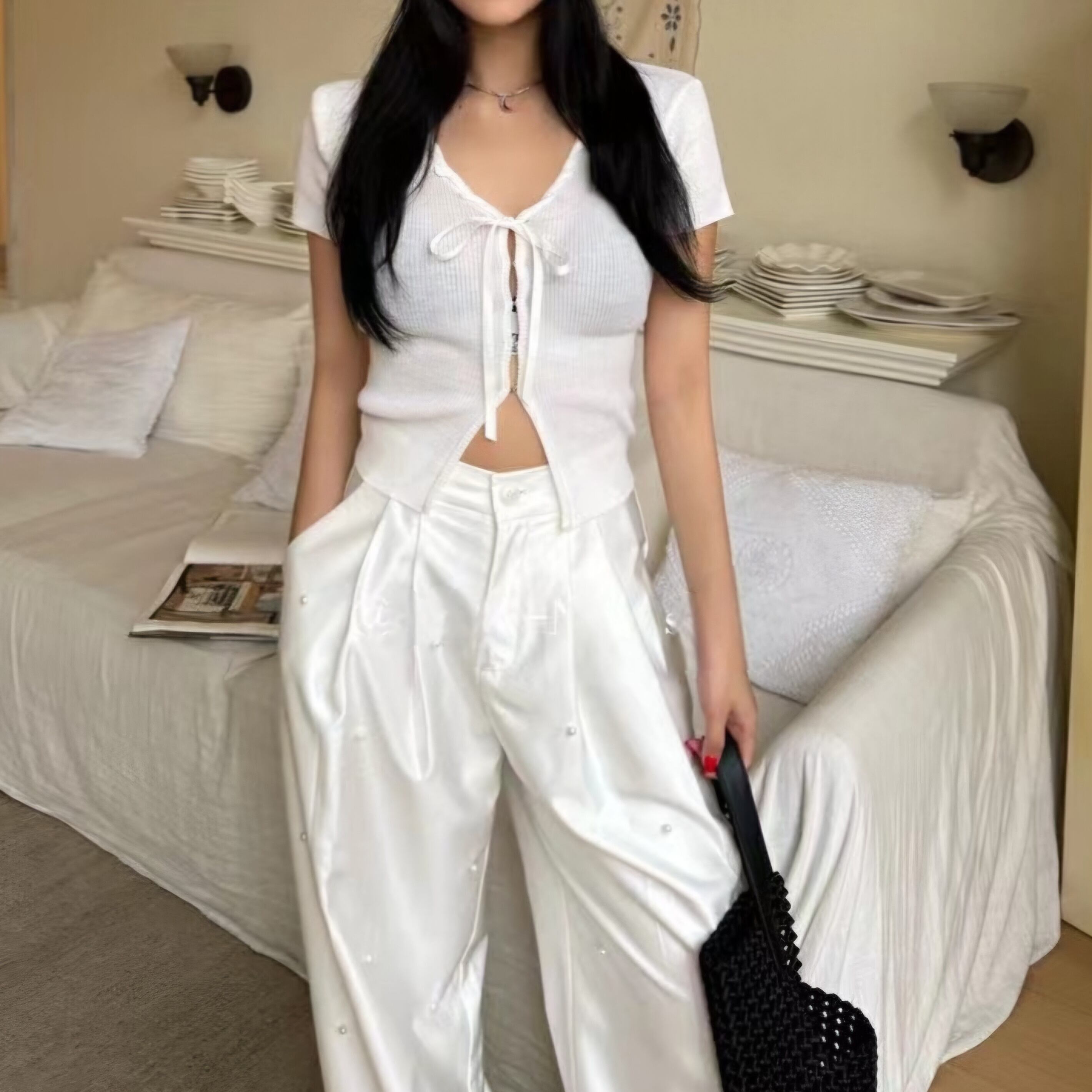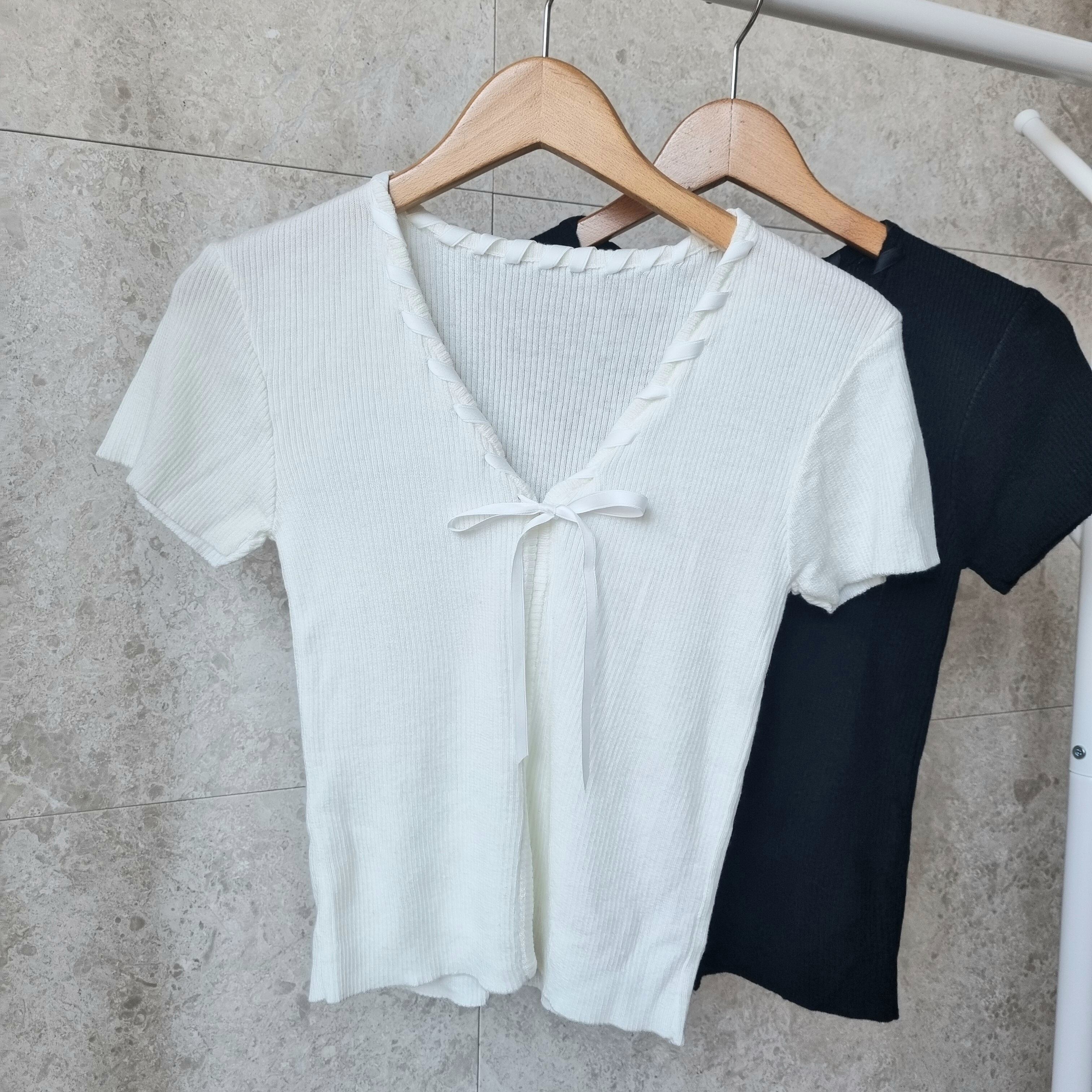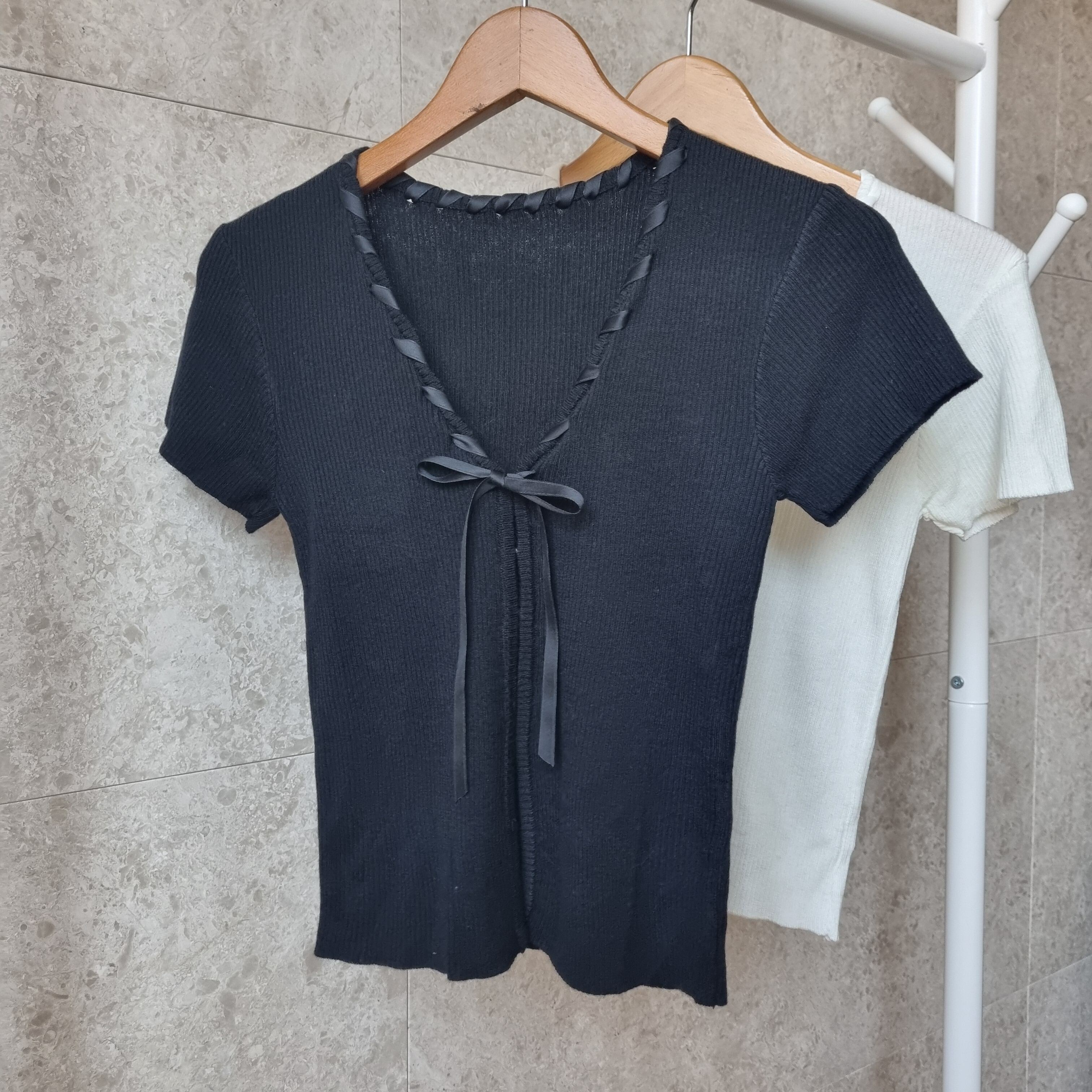【バイヤーお気に入り商品♡】リボン フック カーディガン ニットT Vネック 半袖 へそだし セクシー 個性的 柔らかな生地 韓国