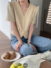 ノーカラーにVネックなのがスッキリ着痩せ効果◎