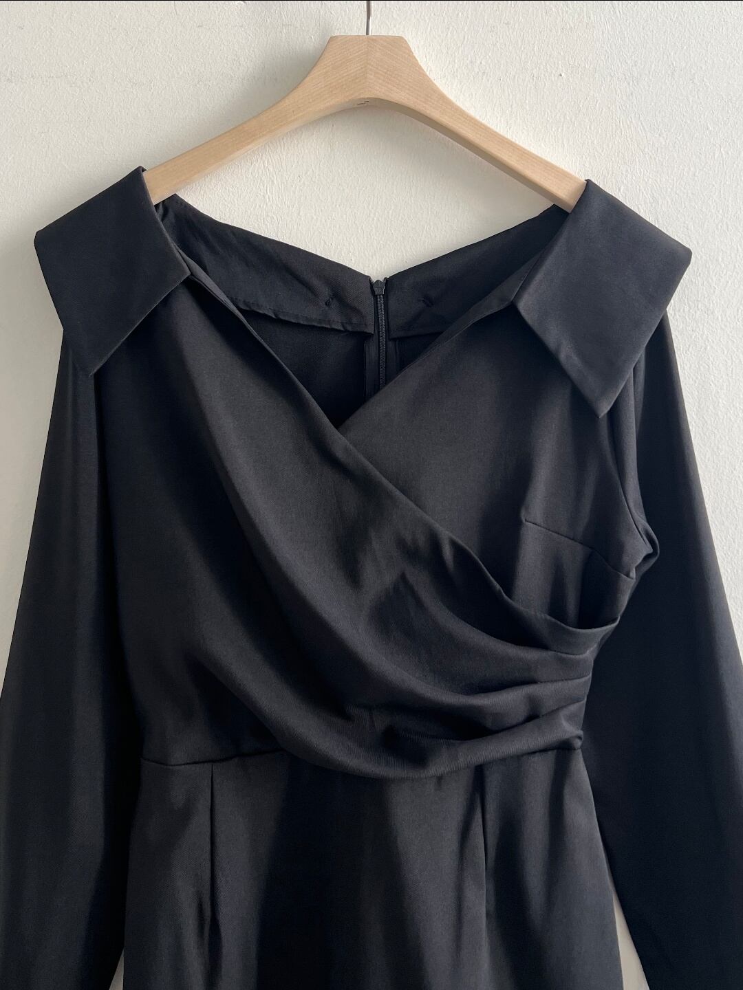 少しオフショルダー気味なネックラインでデコルテを見せる事によりセクシーで女性らしい印象を作ってくれます。